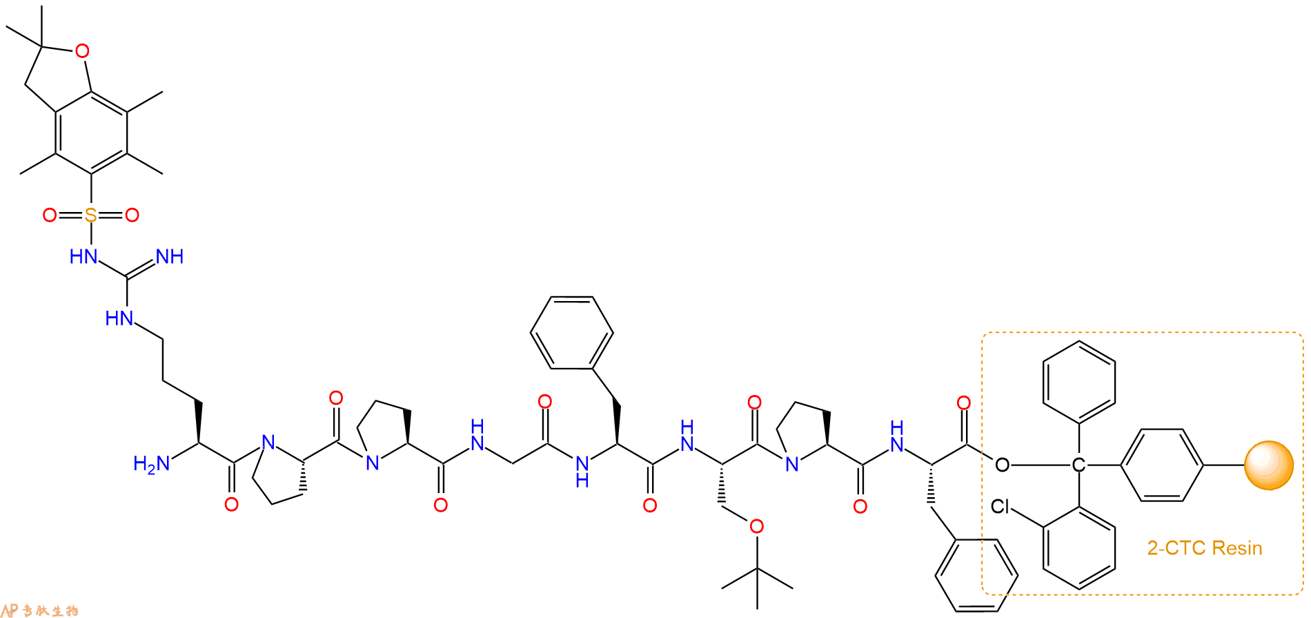 最后再经过步骤二得到 H2N-Arg(Pbf)-Pro-Pro-Gly-Phe-Ser(tBu)-Pro-Phe-CTC Resin,结构如下: