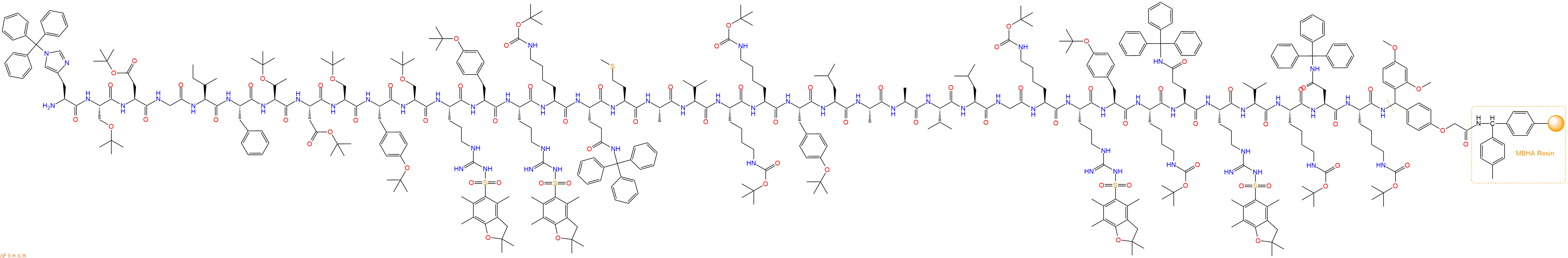 Fmoc-Gly-Ile-Phe-Thr(tBu)-Asp(OtBu)-Ser(tBu)-Tyr(tBu)-Ser(tBu)-Arg(Pbf)-Tyr(tBu)-Arg(Pbf)-Lys(Boc)-Gln(Trt)-Met-Ala-Val-Lys(Boc)-Lys(Boc)-Tyr(tBu)-Leu-Ala-Ala-Val-Leu-Gly-Lys(Boc)-Arg(Pbf)-Tyr(tBu)-Lys(Boc)-Gln(Trt)-Arg(Pbf)-Val-Lys(Boc)-Asn(Trt)-Lys(Boc)-Linker-MBHA Resin