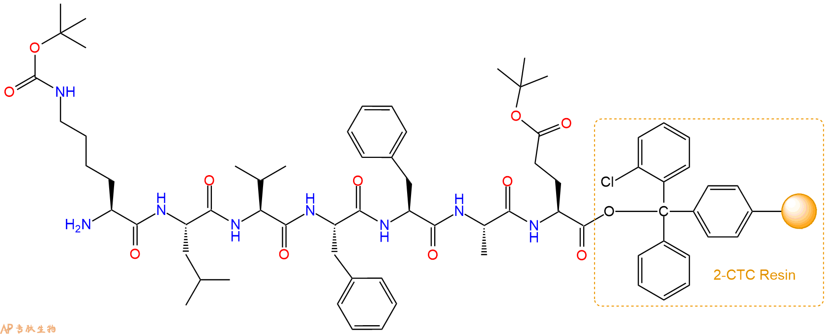 最后再经过步骤二得到 H2N-Lys(Boc)-Leu-Val-Phe-Phe-Ala-Glu(OtBu)-CTC Resin,结构如下: