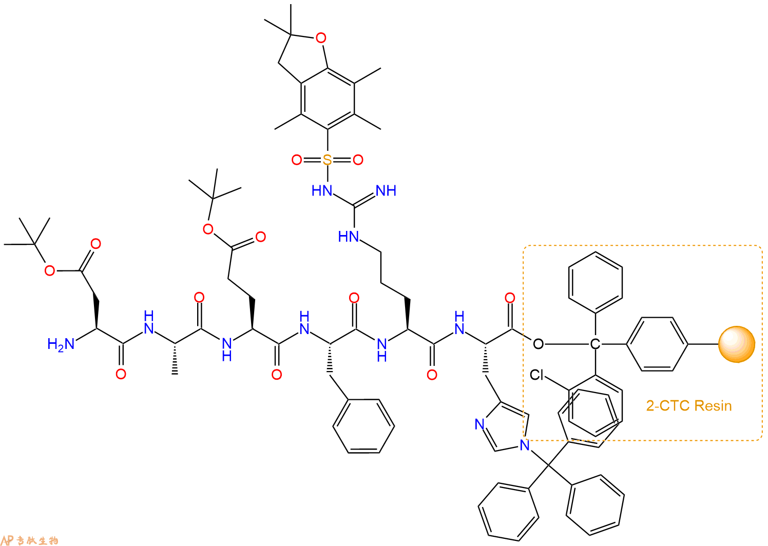 最后再经过步骤二得到 H2N-Asp(OtBu)-Ala-Glu(OtBu)-Phe-Arg(Pbf)-His(Trt)-CTC Resin,结构如下: