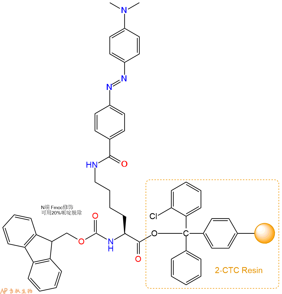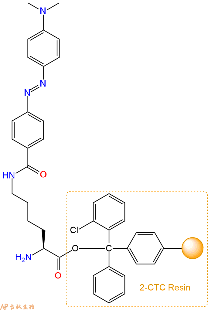 1、合成CTC树脂:称取2.32g CTC Resin(如初始取代度约为0.98mmol/g)和2.73mmol Fmoc-Lys(Dabcyl)-OH于反应器中,加入适量DCM溶解氨基酸(需要注意,此时CTC树脂体积会增大好几倍,避免DCM溶液过少),再加入6.82mmol DIPEA(Mw:129.1,d:0.740g/ml),反应2-3小时后,可不抽滤溶液,直接加入1ml的HPLC级甲醇,封端半小时。依次用DMF洗涤2次,甲醇洗涤1次,DCM洗涤一次,甲醇洗涤一次,DCM洗涤一次,DMF洗涤2次(这里使用甲醇和DCM交替洗涤,是为了更好地去除其他溶质,有利于后续反应)。得到 Fmoc-Lys(Dabcyl)-CTC Resin。结构图如下: