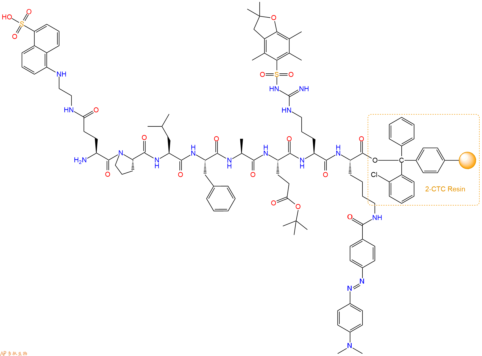 最后再经过步骤二得到 H2N-Glu(Edans)-Pro-Leu-Phe-Ala-Glu(OtBu)-Arg(Pbf)-Lys(Dabcyl)-CTC Resin,结构如下: