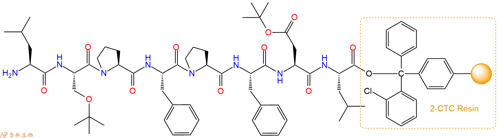 最后再经过步骤二得到 H2N-Leu-Ser(tBu)-Pro-Phe-Pro-Phe-Asp(OtBu)-Leu-CTC Resin,结构如下: