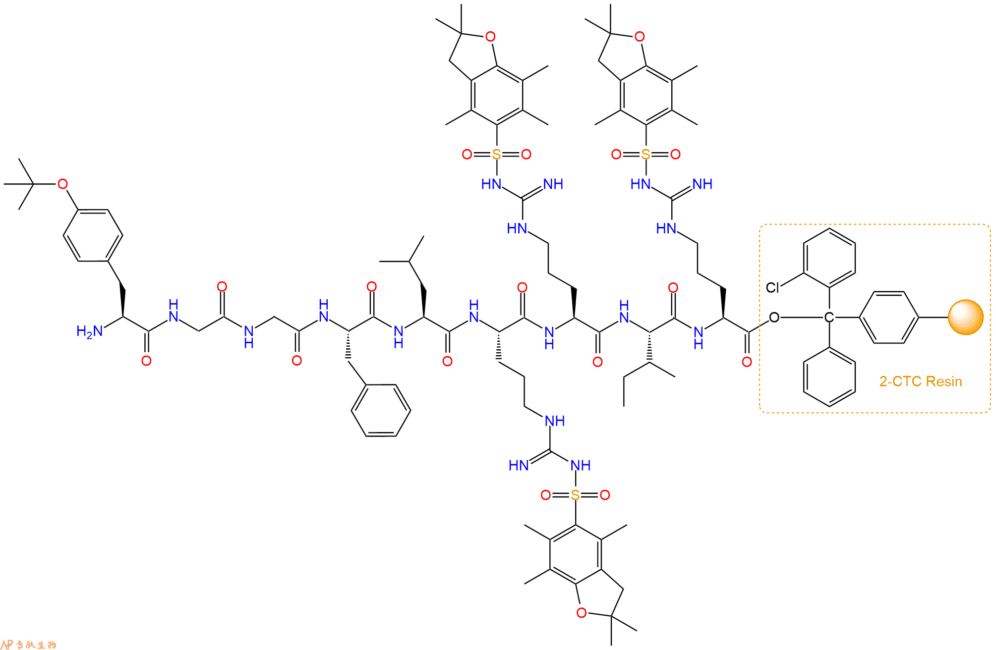 最后再经过步骤二得到 H2N-Tyr(tBu)-Gly-Gly-Phe-Leu-Arg(Pbf)-Arg(Pbf)-Ile-Arg(Pbf)-CTC Resin,结构如下: