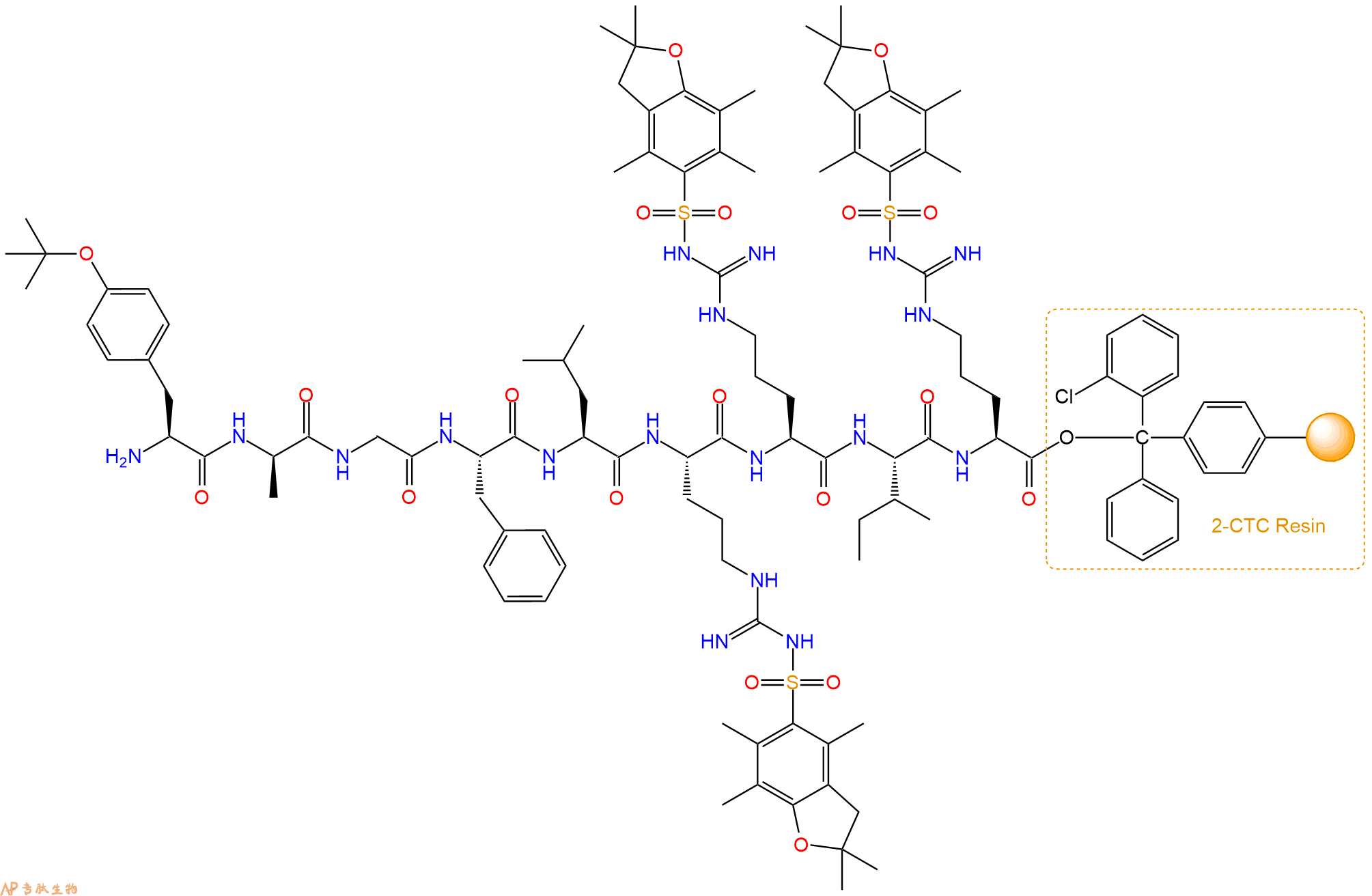 最后再经过步骤二得到 H2N-Tyr(tBu)-DAla-Gly-Phe-Leu-Arg(Pbf)-Arg(Pbf)-Ile-Arg(Pbf)-CTC Resin,结构如下: