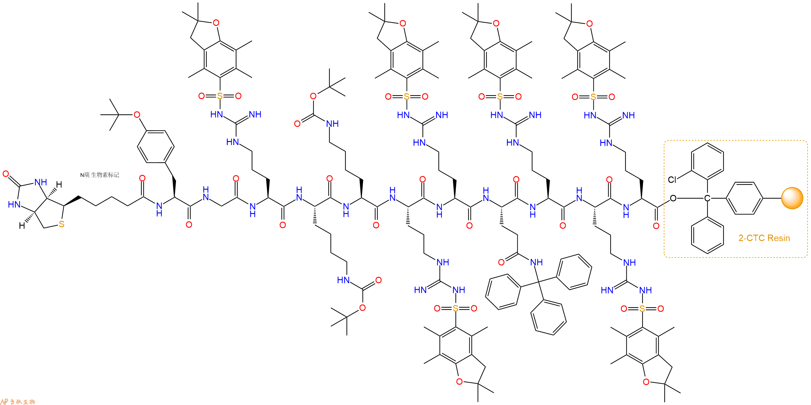 5、生物素反应连接:在上述树脂中,加入适当DMF后,再加入1.73mmol 生物素到树脂中,再加入3.46mmol DIPEA、1.64mmol HBTU,鼓氮气反应30分钟。用2倍树脂体积的DMF 洗涤3次树脂(洗涤树脂,去掉残留溶剂,为下一步反应做准备)。 得到Biotin-Tyr(tBu)-Gly-Arg(Pbf)-Lys(Boc)-Lys(Boc)-Arg(Pbf)-Arg(Pbf)-Gln(Trt)-Arg(Pbf)-Arg(Pbf)-Arg(Pbf)-CTCResin。 结构如下: