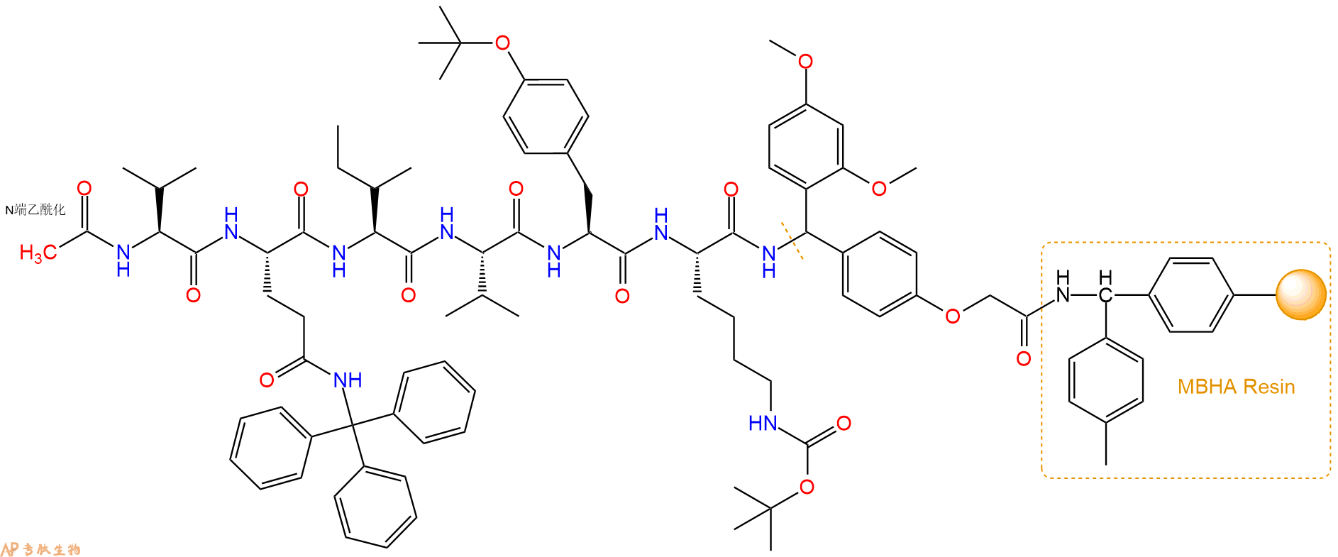 5、乙酸酐反应连接:在上述树脂中,加入适当DMF后,再加入2.11mmol乙酸酐到树脂中,再加入4.23mmol DIPEA,鼓氮气反应30分钟。用2倍树脂体积的DMF 洗涤3次树脂(洗涤树脂,去掉残留溶剂,为下一步反应做准备)。 得到Ac-Val-Gln(Trt)-Ile-Val-Tyr(tBu)-Lys(Boc)-Linker-MBHAResin。 结构如下: