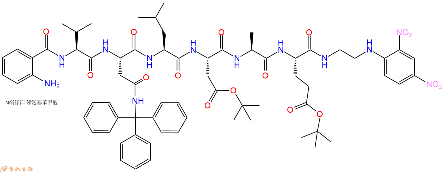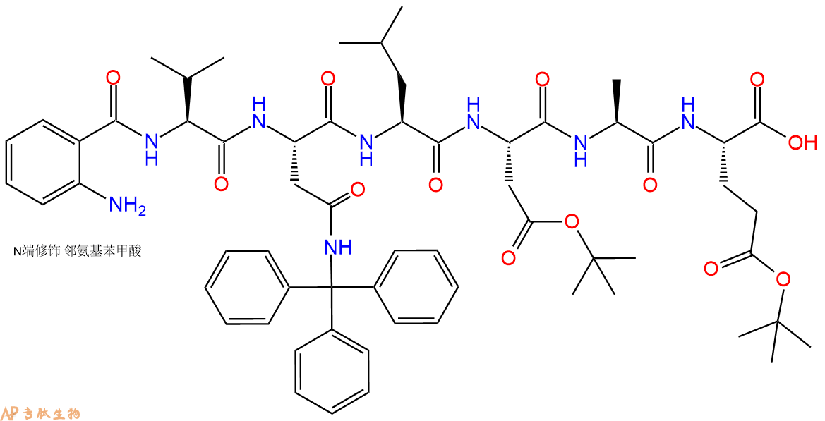 6、全保护切割:配置0.5%TFA/DCM溶液,溶液体积约为树脂体积的3倍。再次用DCM洗涤树脂2遍(去除残留DMF),后将配置好的溶液倒入到反应器中,反应30分钟。抽滤树脂,收集滤液(此时多肽已经从树脂上分离,存在于滤液中)。多肽序列为 Abz-Val-Asn(Trt)-Leu-Asp(OtBu)-Ala-Glu(OtBu)-CTC Resin。 在滤液中添加DIEPA,调PH至7-8。用饱和NaHCO3洗涤滤液,分离出DCM层溶液。可适当旋蒸DCM层溶液,减少有机溶剂。再次加入1或2倍体积的乙酸乙酯,用稀HCl溶液调PH至微酸性,将多肽从DCM层萃取到乙酸乙酯层。用饱和NaCl洗涤2次乙酸乙酯层。用无水硫酸镁吸收乙酸乙酯层的水分。通过减压旋蒸,直接将乙酸乙酯完全旋蒸掉,得到晶体状固体多肽,用于下一步C端反应。或通过减压旋蒸保留适量乙酸乙酯的溶液体积,加入冰乙醚析出 多肽,然后对多肽进行烘干操作即可用于下一步C端反应。Abz-Val-Asn(Trt)-Leu-Asp(OtBu)-Ala-Glu(OtBu)-COOH的结构图如下。