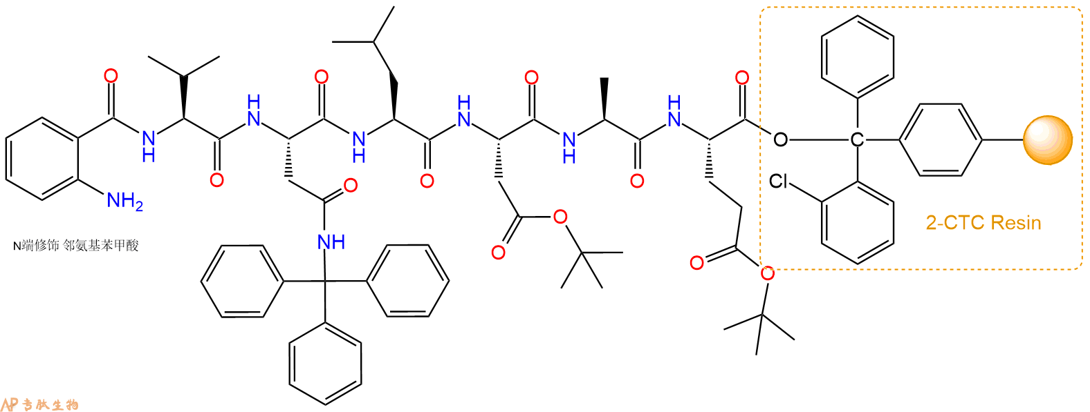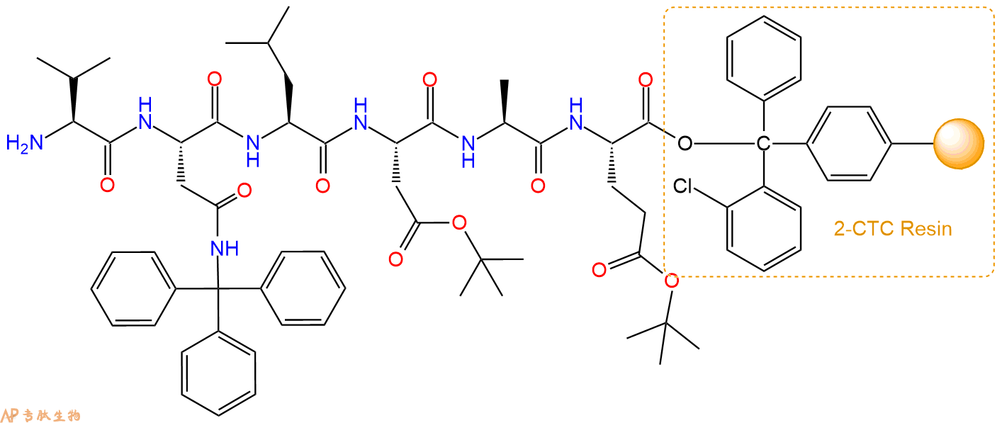 最后再经过步骤二得到 H2N-Val-Asn(Trt)-Leu-Asp(OtBu)-Ala-Glu(OtBu)-CTC Resin,结构如下: