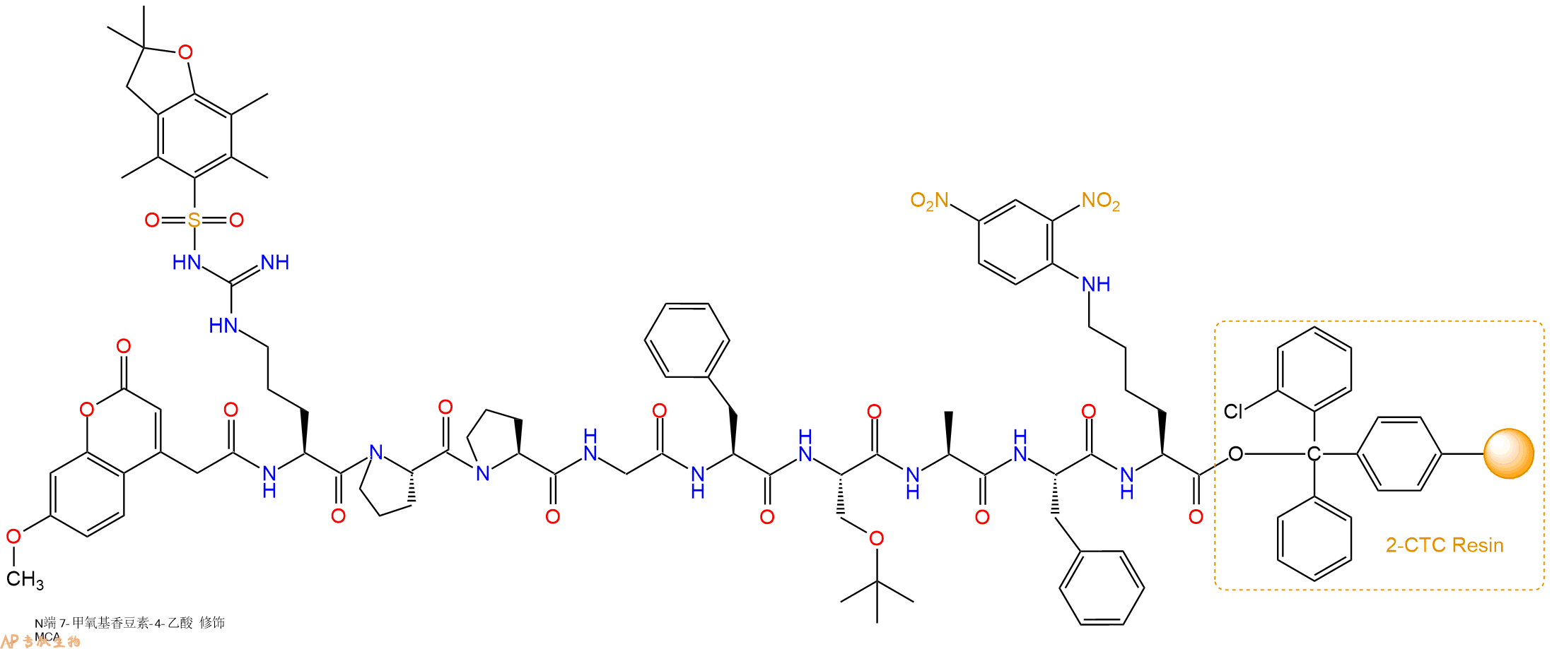 5、7-甲氧基香豆素-4-乙酸(MCA)反应连接:在上述树脂中,加入适当DMF后,再加入2.5mmol 7-甲氧基香豆素-4-乙酸(MCA)到树脂中,再加入5.01mmol DIPEA、2.38mmol HBTU,鼓氮气反应30分钟。用2倍树脂体积的DMF 洗涤3次树脂(洗涤树脂,去掉残留溶剂,为下一步反应做准备)。 得到MCA-Arg(Pbf)-Pro-Pro-Gly-Phe-Ser(tBu)-Ala-Phe-Lys(Dnp)-CTCResin。 结构如下: