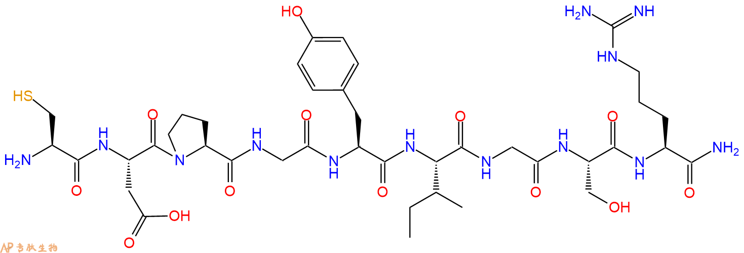 5、切割:6倍树脂体积的切割液(或每1g树脂加8ml左右的切割液),摇床摇晃 2小时,过滤掉树脂,用冰无水乙醚沉淀滤液,并用冰无水乙醚洗涤沉淀物3次,最后将沉淀物放真空干燥釜中,常温干燥24小试,得到粗品H2N-Cys-Asp-Pro-Gly-Tyr-Ile-Gly-Ser-Arg-NH2。结构图见产品结构图。