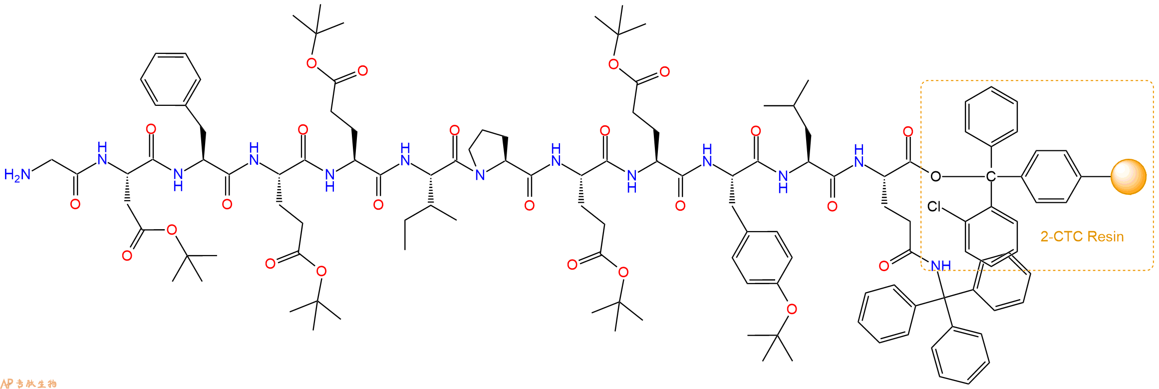 最后再经过步骤二得到 H2N-Gly-Asp(OtBu)-Phe-Glu(OtBu)-Glu(OtBu)-Ile-Pro-Glu(OtBu)-Glu(OtBu)-Tyr(tBu)-Leu-Gln(Trt)-CTC Resin,结构如下:
