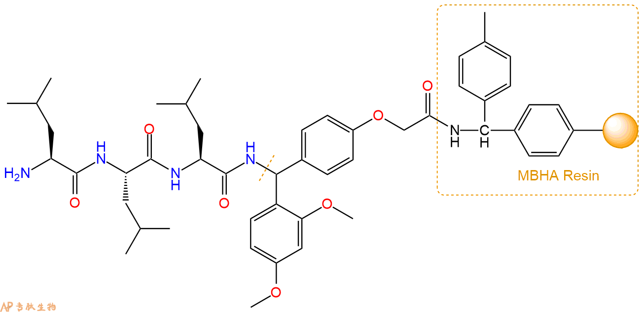 最后再经过步骤二得到 H2N-Leu-Leu-Leu-Linker-MBHA Resin,结构如下: