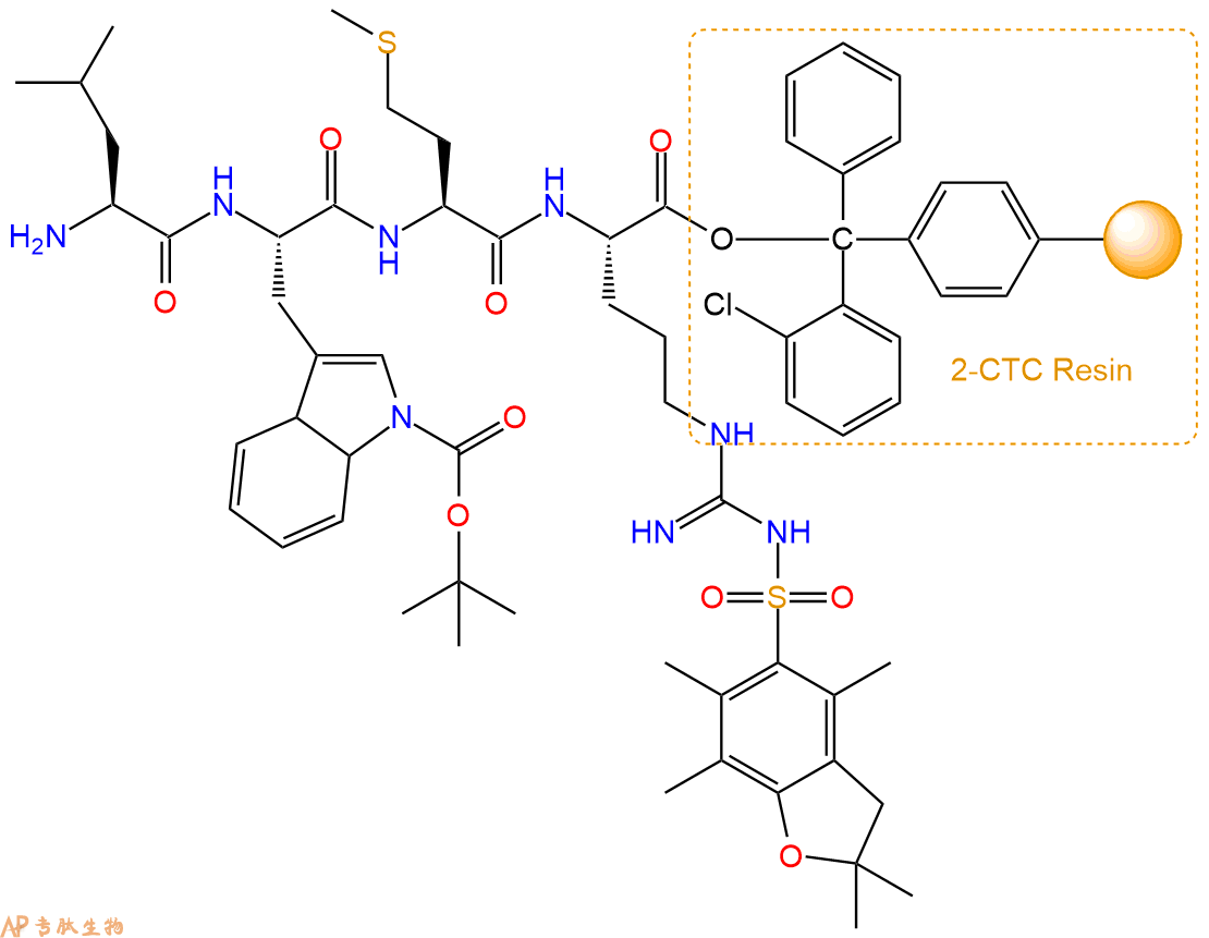 最后再经过步骤二得到 H2N-Leu-Trp(Boc)-Met-Arg(Pbf)-CTC Resin,结构如下: