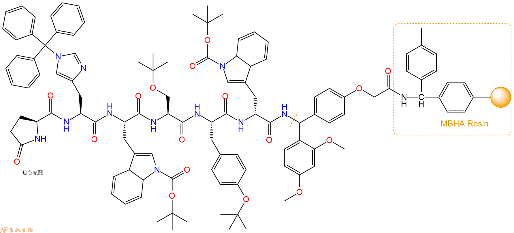 5、焦谷氨酸反应连接:在上述树脂中,加入适当DMF后,再加入2.66mmol 焦谷氨酸到树脂中,再加入5.33mmol DIPEA、2.53mmol HBTU,鼓氮气反应30分钟。用2倍树脂体积的DMF 洗涤3次树脂(洗涤树脂,去掉残留溶剂,为下一步反应做准备)。 得到Pyr-His(Trt)-Trp(Boc)-Ser(tBu)-Tyr(tBu)-DTrp(Boc)-Linker-MBHAResin。 结构如下: