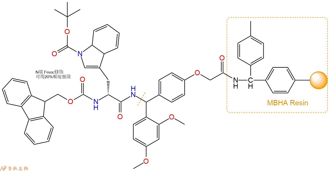 1、合成MBHA树脂:取若干克MBHA树脂(如初始取代度为0.5mmol/g)和1倍树脂摩尔量的Fmoc-Linker-OH加入到反应器中,加入DMF,搅拌使氨基酸完全溶解。再加入树脂2倍量的DIEPA,搅拌混合均匀。再加入树脂0.95倍量的HBTU,搅拌混合均匀。反应3-4小时后,用DMF洗涤3次。用2倍树脂体积的10%乙酸酐/DMF 进行封端30分钟。然后再用DMF洗涤3次,甲醇洗涤2次,DCM洗涤2次,再用甲醇洗涤2次。真空干燥12小时以上,得到干燥的树脂{Fmoc-Linker-MHBA Resin},测定取代度。这里测得取代度为 0.3mmol/g。结构如下图: