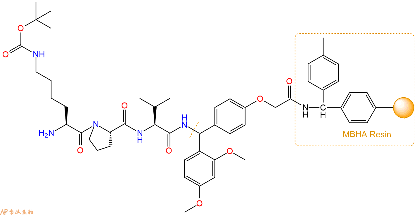 最后再经过步骤二得到 H2N-Lys(Boc)-Pro-Val-Linker-MBHA Resin,结构如下: