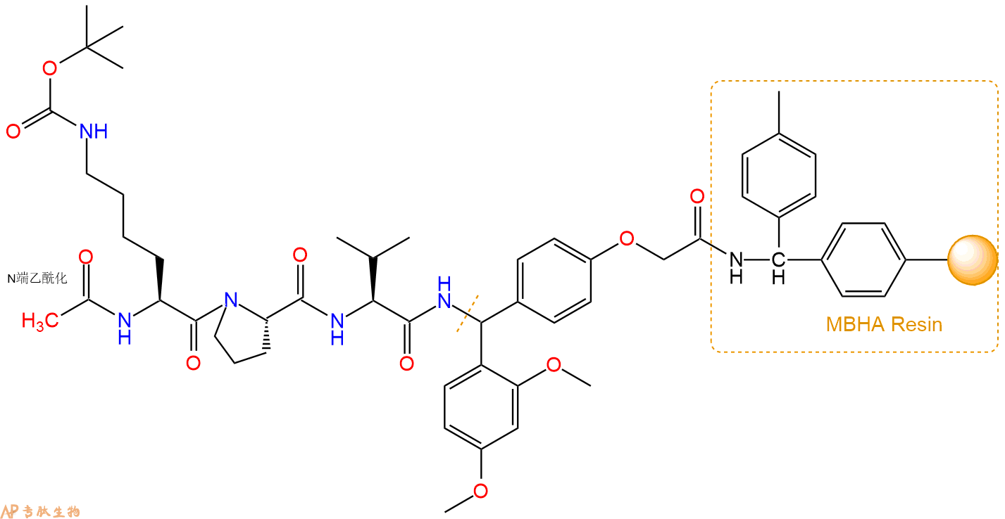 5、乙酸酐反应连接:在上述树脂中,加入适当DMF后,再加入2.64mmol乙酸酐到树脂中,再加入5.27mmol DIPEA,鼓氮气反应30分钟。用2倍树脂体积的DMF 洗涤3次树脂(洗涤树脂,去掉残留溶剂,为下一步反应做准备)。 得到Ac-Lys(Boc)-Pro-Val-Linker-MBHAResin。 结构如下: