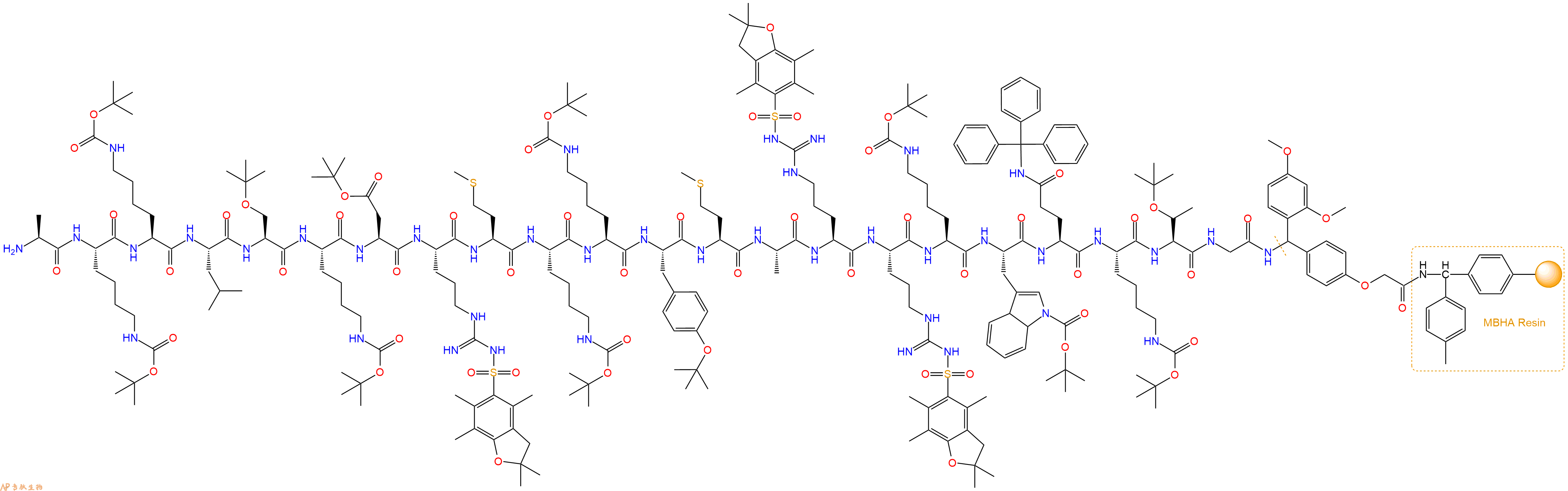 最后再经过步骤二得到 H2N-Ala-Lys(Boc)-Lys(Boc)-Leu-Ser(tBu)-Lys(Boc)-Asp(OtBu)-Arg(Pbf)-Met-Lys(Boc)-Lys(Boc)-Tyr(tBu)-Met-Ala-Arg(Pbf)-Arg(Pbf)-Lys(Boc)-Trp(Boc)-Gln(Trt)-Lys(Boc)-Thr(tBu)-Gly-Linker-MBHA Resin,结构如下: