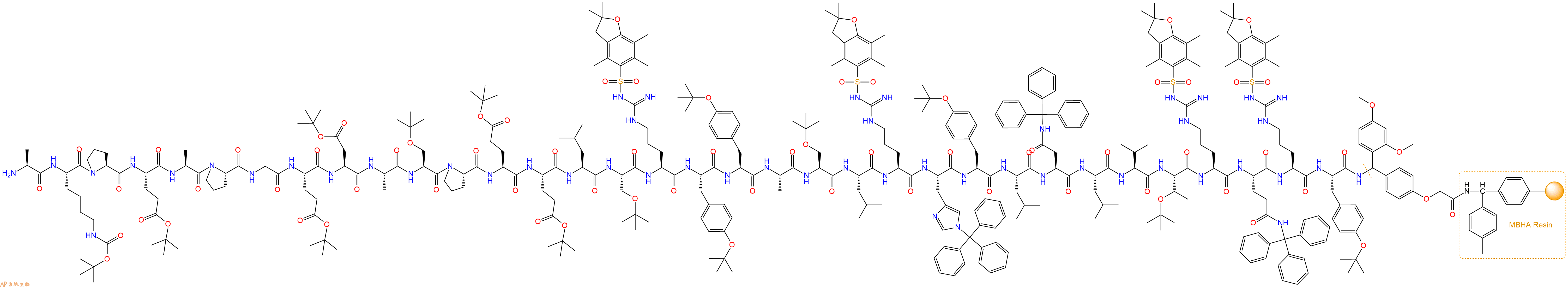 Fmoc-Ala-Lys(Boc)-Pro-Glu(OtBu)-Ala-Pro-Gly-Glu(OtBu)-Asp(OtBu)-Ala-Ser(tBu)-Pro-Glu(OtBu)-Glu(OtBu)-Leu-Ser(tBu)-Arg(Pbf)-Tyr(tBu)-Tyr(tBu)-Ala-Ser(tBu)-Leu-Arg(Pbf)-His(Trt)-Tyr(tBu)-Leu-Asn(Trt)-Leu-Val-Thr(tBu)-Arg(Pbf)-Gln(Trt)-Arg(Pbf)-Tyr(tBu)-Linker-MBHA Resin