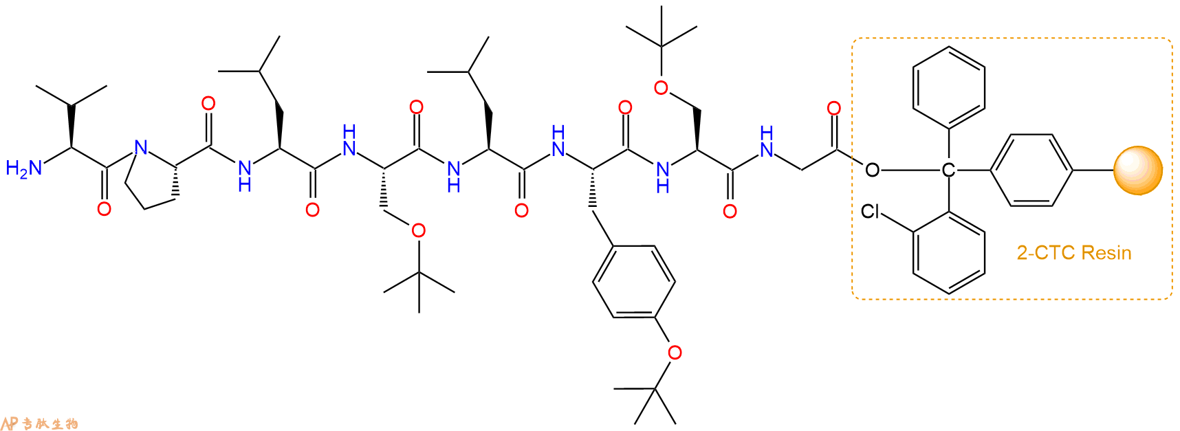 最后再经过步骤二得到 H2N-Val-Pro-Leu-Ser(tBu)-Leu-Tyr(tBu)-Ser(tBu)-Gly-CTC Resin,结构如下: