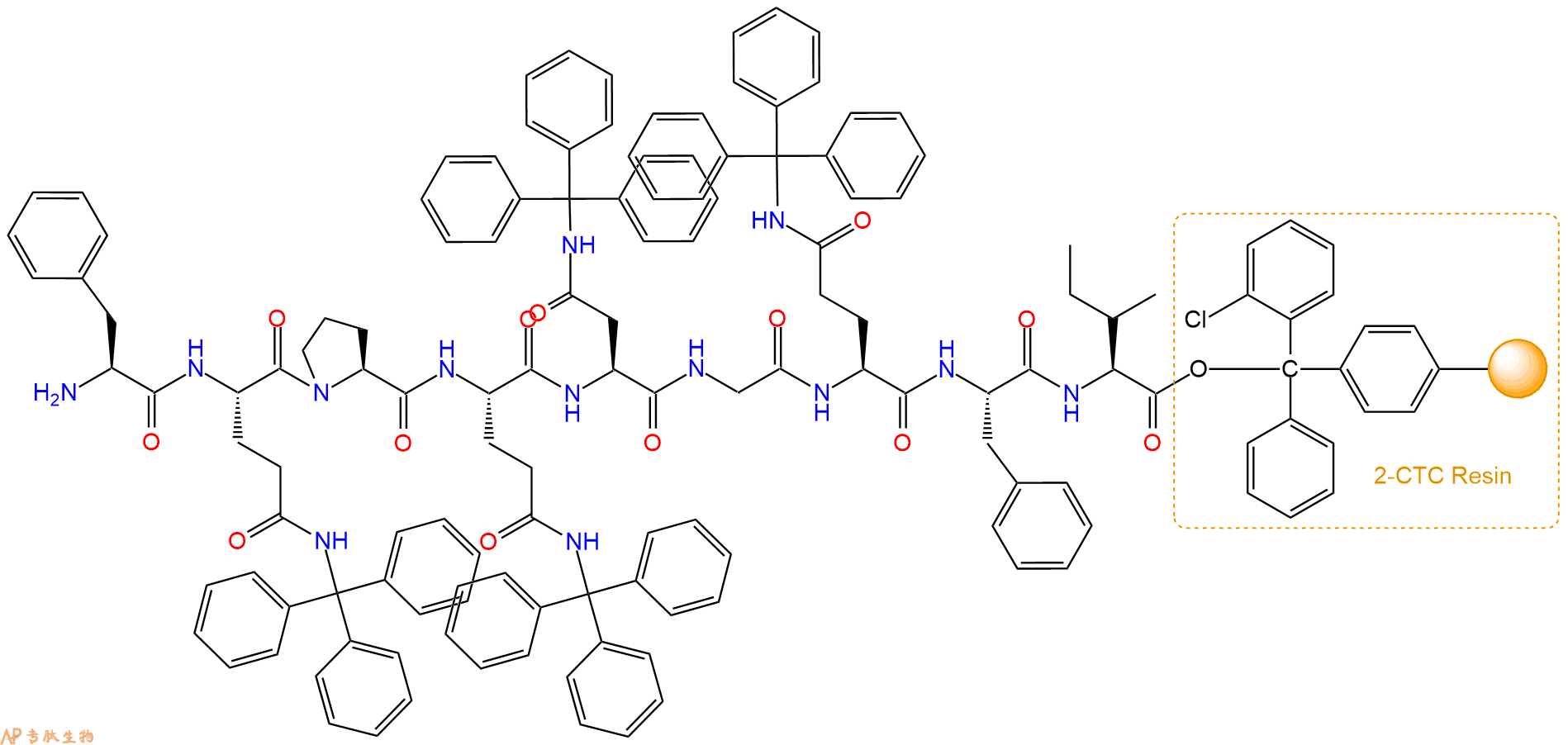 最后再经过步骤二得到 H2N-Phe-Gln(Trt)-Pro-Gln(Trt)-Asn(Trt)-Gly-Gln(Trt)-Phe-Ile-CTC Resin,结构如下: