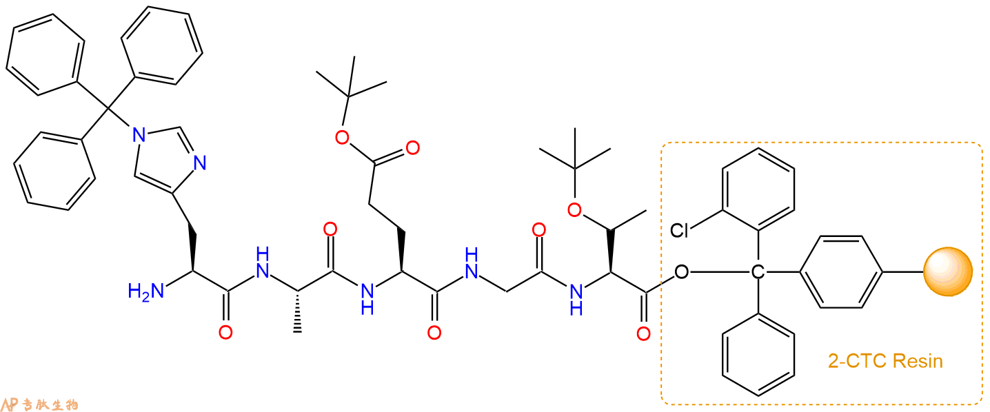 最后再经过步骤二得到 H2N-His(Trt)-Ala-Glu(OtBu)-Gly-Thr(tBu)-CTC Resin,结构如下:
