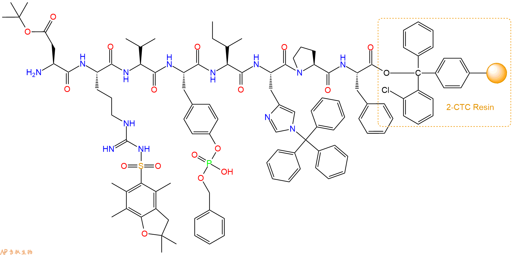 最后再经过步骤二得到 H2N-Asp(OtBu)-Arg(Pbf)-Val-Tyr(HPO3Bzl)-Ile-His(Trt)-Pro-Phe-CTC Resin,结构如下: