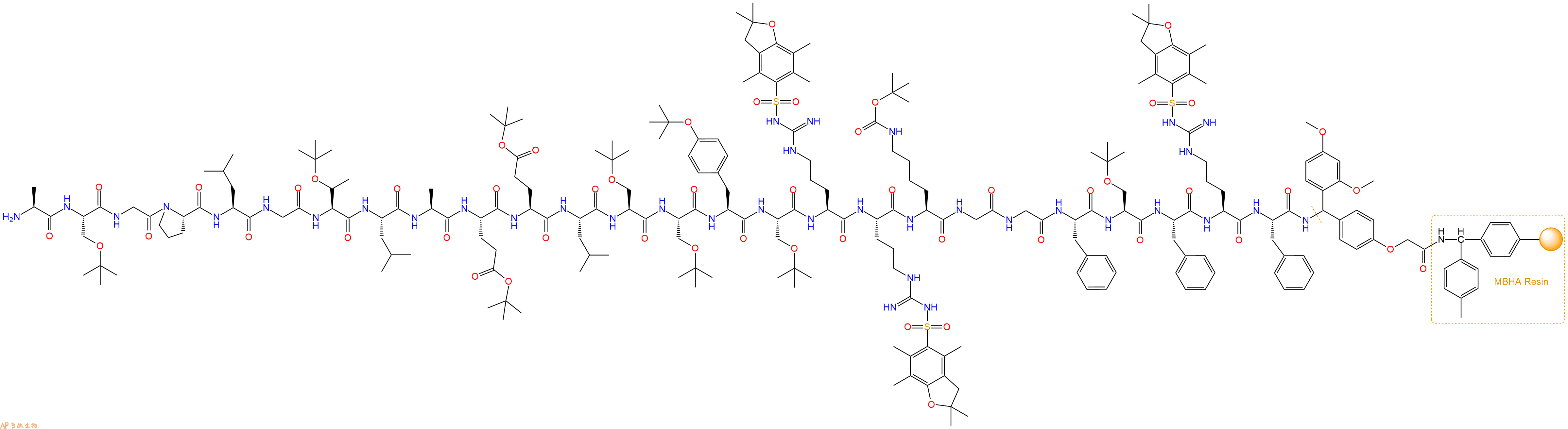 Fmoc-Ala-Ser(tBu)-Gly-Pro-Leu-Gly-Thr(tBu)-Leu-Ala-Glu(OtBu)-Glu(OtBu)-Leu-Ser(tBu)-Ser(tBu)-Tyr(tBu)-Ser(tBu)-Arg(Pbf)-Arg(Pbf)-Lys(Boc)-Gly-Gly-Phe-Ser(tBu)-Phe-Arg(Pbf)-Phe-Linker-MBHA Resin