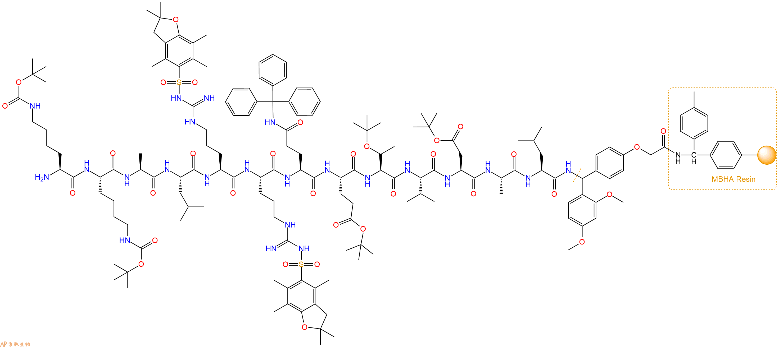 H2N-Lys(Boc)-Ala-Leu-Arg(Pbf)-Arg(Pbf)-Gln(Trt)-Glu(OtBu)-Thr(tBu)-Val-Asp(OtBu)-Ala-Leu-Linker-MBHA Resin