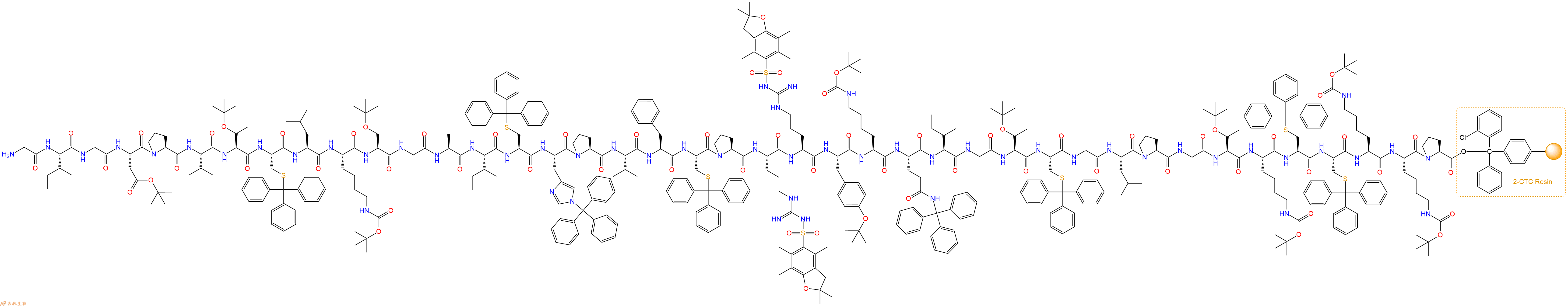 H2N-Thr(tBu)-Cys(Trt)-Leu-Lys(Boc)-Ser(tBu)-Gly-Ala-Ile-Cys(Trt)-His(Trt)-Pro-Val-Phe-Cys(Trt)-Pro-Arg(Pbf)-Arg(Pbf)-Tyr(tBu)-Lys(Boc)-Gln(Trt)-Ile-Gly-Thr(tBu)-Cys(Trt)-Gly-Leu-Pro-Gly-Thr(tBu)-Lys(Boc)-Cys(Trt)-Cys(Trt)-Lys(Boc)-Lys(Boc)-Pro-CTC Resin
