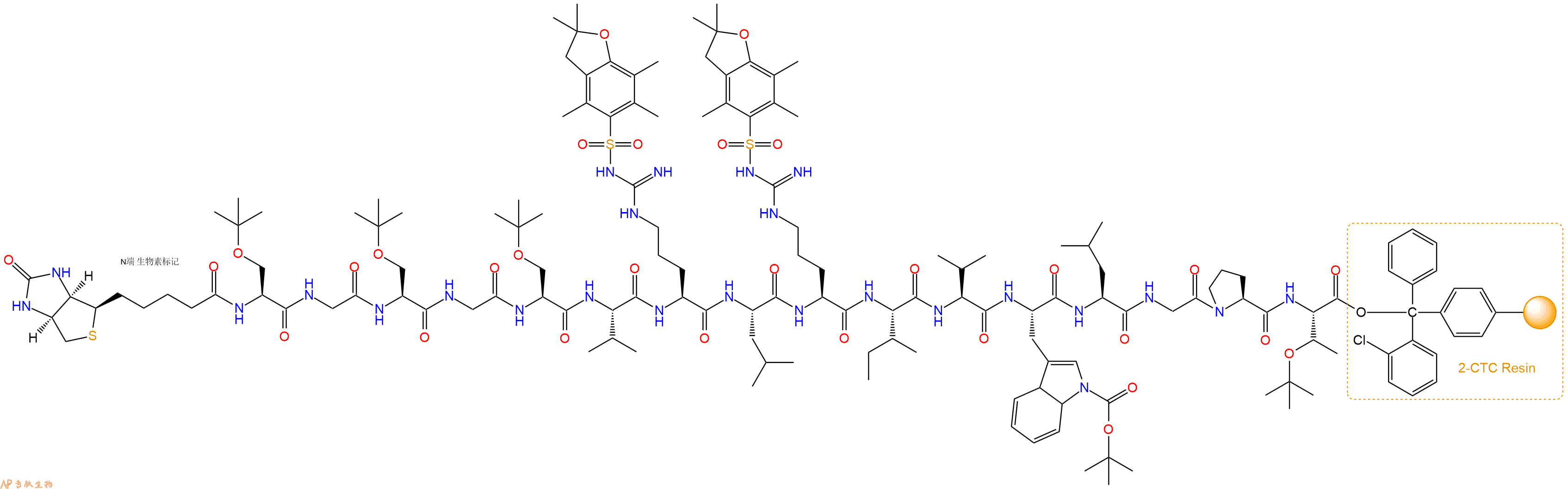 5、生物素反应连接:在上述树脂中,加入适当DMF后,再加入9.64mmol 生物素到树脂中,再加入19.28mmol DIPEA、9.16mmol HBTU,鼓氮气反应30分钟。用2倍树脂体积的DMF 洗涤3次树脂(洗涤树脂,去掉残留溶剂,为下一步反应做准备)。 得到Biotin-Ser(tBu)-Gly-Ser(tBu)-Gly-Ser(tBu)-Val-Arg(Pbf)-Leu-Arg(Pbf)-Ile-Val-Trp(Boc)-Leu-Gly-Pro-Thr(tBu)-CTCResin。 结构如下: