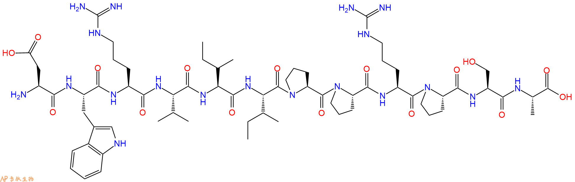 5、切割:6倍树脂体积的切割液(或每1g树脂加8ml左右的切割液),摇床摇晃 2小时,过滤掉树脂,用冰无水乙醚沉淀滤液,并用冰无水乙醚洗涤沉淀物3次,最后将沉淀物放真空干燥釜中,常温干燥24小试,得到粗品H2N-Asp-Trp-Arg-Val-Ile-Ile-Pro-Pro-Arg-Pro-Ser-Ala-COOH。结构图见产品结构图。