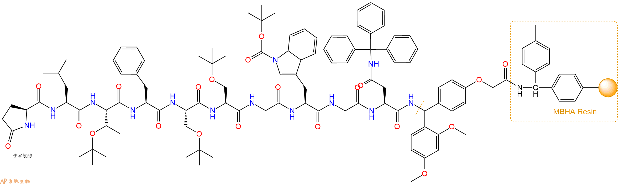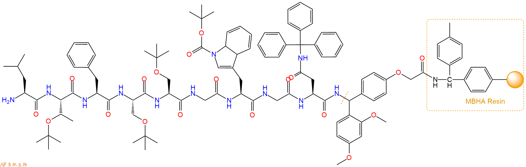 最后再经过步骤二得到 H2N-Leu-Thr(tBu)-Phe-Ser(tBu)-Ser(tBu)-Gly-Trp(Boc)-Gly-Asn(Trt)-Linker-MBHA Resin,结构如下: