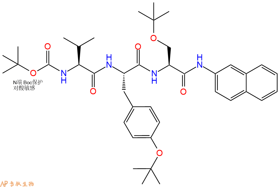 7、2-萘胺反应连接:在上述树脂中,加入适当DMF后,再加入0.67mmol 2-萘胺到树脂中,再加入1.34mmol DIPEA、0.64mmol HBTU,鼓氮气反应30分钟。用2倍树脂体积的DMF 洗涤3次树脂(洗涤树脂,去掉残留溶剂,为下一步反应做准备)。 得到 Boc-Val-Tyr(tBu)-Ser(tBu)-βNA。 结构如下: