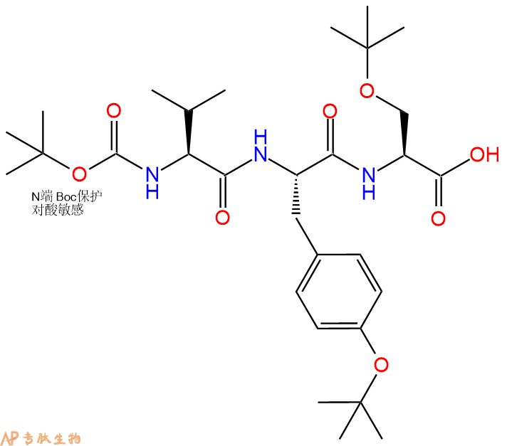 6、全保护切割:配置0.5%TFA/DCM溶液,溶液体积约为树脂体积的3倍。再次用DCM洗涤树脂2遍(去除残留DMF),后将配置好的溶液倒入到反应器中,反应30分钟。抽滤树脂,收集滤液(此时多肽已经从树脂上分离,存在于滤液中)。多肽序列为 Boc-Val-Tyr(tBu)-Ser(tBu)-CTC Resin。 在滤液中添加DIEPA,调PH至7-8。用饱和NaHCO3洗涤滤液,分离出DCM层溶液。可适当旋蒸DCM层溶液,减少有机溶剂。再次加入1或2倍体积的乙酸乙酯,用稀HCl溶液调PH至微酸性,将多肽从DCM层萃取到乙酸乙酯层。用饱和NaCl洗涤2次乙酸乙酯层。用无水硫酸镁吸收乙酸乙酯层的水分。通过减压旋蒸,直接将乙酸乙酯完全旋蒸掉,得到晶体状固体多肽,用于下一步C端反应。或通过减压旋蒸保留适量乙酸乙酯的溶液体积,加入冰乙醚析出 多肽,然后对多肽进行烘干操作即可用于下一步C端反应。Boc-Val-Tyr(tBu)-Ser(tBu)-COOH的结构图如下。