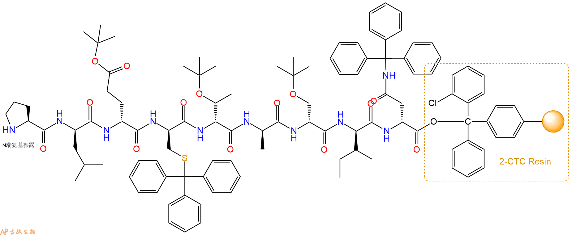 最后再经过步骤二得到 H2N-Pro-DLeu-DGlu(OtBu)-DCys(Trt)-DThr(tBu)-DAla-DSer(tBu)-DIle-DAsn(Trt)-CTC Resin,结构如下: