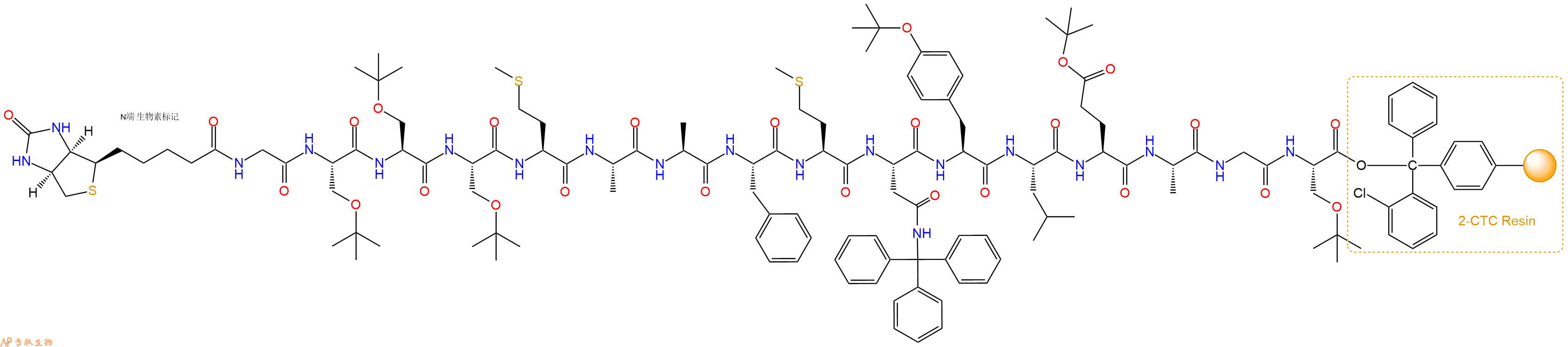 5、生物素反应连接:在上述树脂中,加入适当DMF后,再加入1.53mmol 生物素到树脂中,再加入3.06mmol DIPEA、1.46mmol HBTU,鼓氮气反应30分钟。用2倍树脂体积的DMF 洗涤3次树脂(洗涤树脂,去掉残留溶剂,为下一步反应做准备)。 得到Biotin-Gly-Ser(tBu)-Ser(tBu)-Ser(tBu)-Met-Ala-Ala-Phe-Met-Asn(Trt)-Tyr(tBu)-Leu-Glu(OtBu)-Ala-Gly-Ser(tBu)-CTCResin。 结构如下: