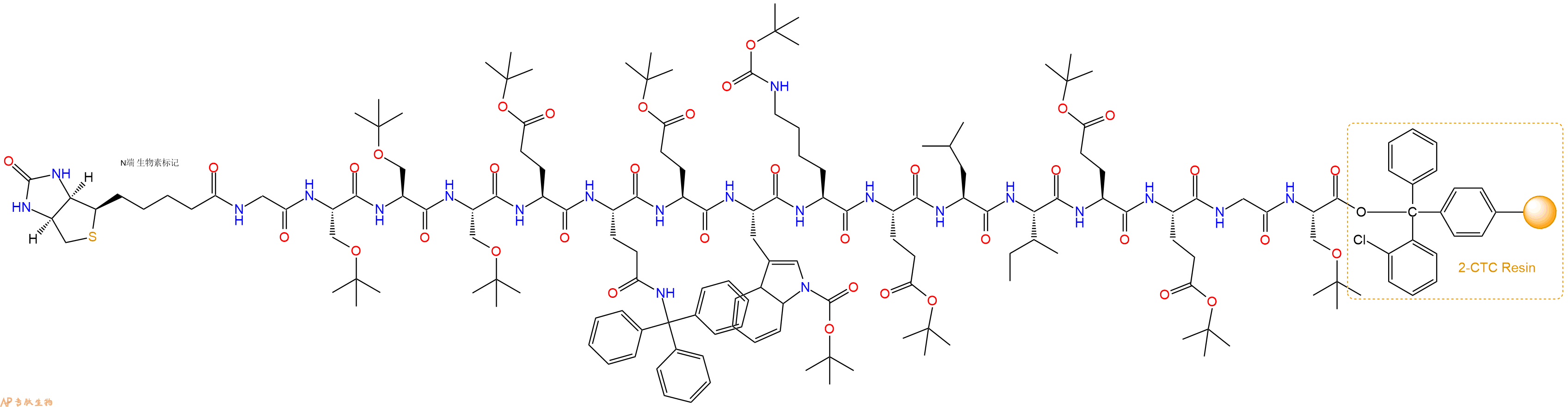 5、生物素反应连接:在上述树脂中,加入适当DMF后,再加入7.06mmol 生物素到树脂中,再加入14.12mmol DIPEA、6.71mmol HBTU,鼓氮气反应30分钟。用2倍树脂体积的DMF 洗涤3次树脂(洗涤树脂,去掉残留溶剂,为下一步反应做准备)。 得到Biotin-Gly-Ser(tBu)-Ser(tBu)-Ser(tBu)-Glu(OtBu)-Gln(Trt)-Glu(OtBu)-Trp(Boc)-Lys(Boc)-Glu(OtBu)-Leu-Ile-Glu(OtBu)-Glu(OtBu)-Gly-Ser(tBu)-CTCResin。 结构如下: