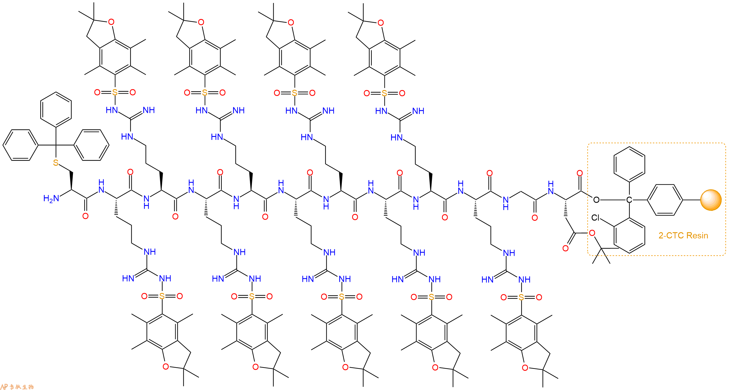 最后再经过步骤二得到 H2N-Cys(Trt)-Arg(Pbf)-Arg(Pbf)-Arg(Pbf)-Arg(Pbf)-Arg(Pbf)-Arg(Pbf)-Arg(Pbf)-Arg(Pbf)-Arg(Pbf)-Gly-Asp(OtBu)-CTC Resin,结构如下: