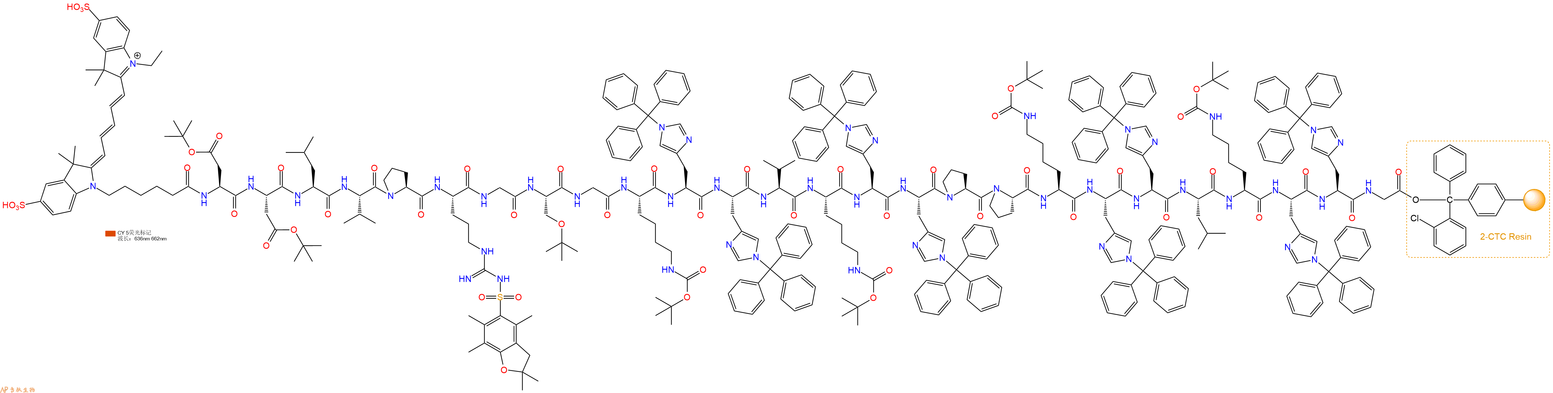 5、荧光标记物CY5-COOH反应连接:在上述树脂中,加入适当DMF后,再加入0.45mmol 荧光标记物CY5-COOH到树脂中,再加入0.89mmol DIPEA、0.42mmol HBTU,鼓氮气反应30分钟。用2倍树脂体积的DMF 洗涤3次树脂(洗涤树脂,去掉残留溶剂,为下一步反应做准备)。 得到CY5-Asp(OtBu)-Asp(OtBu)-Leu-Val-Pro-Arg(Pbf)-Gly-Ser(tBu)-Gly-Lys(Boc)-His(Trt)-His(Trt)-Val-Lys(Boc)-His(Trt)-His(Trt)-Pro-Pro-Lys(Boc)-His(Trt)-His(Trt)-Leu-Lys(Boc)-His(Trt)-His(Trt)-Gly-CTCResin。 结构如下: