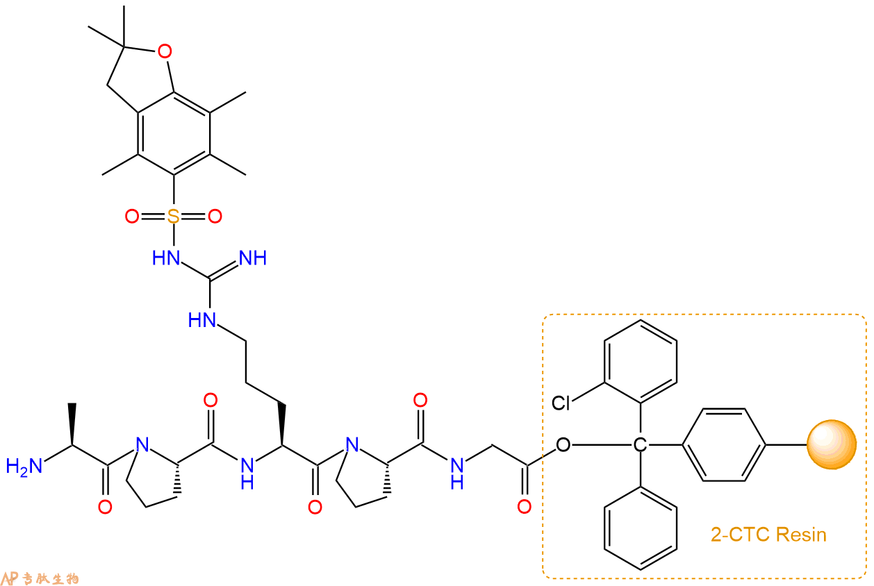 最后再经过步骤二得到 H2N-Ala-Pro-Arg(Pbf)-Pro-Gly-CTC Resin,结构如下: