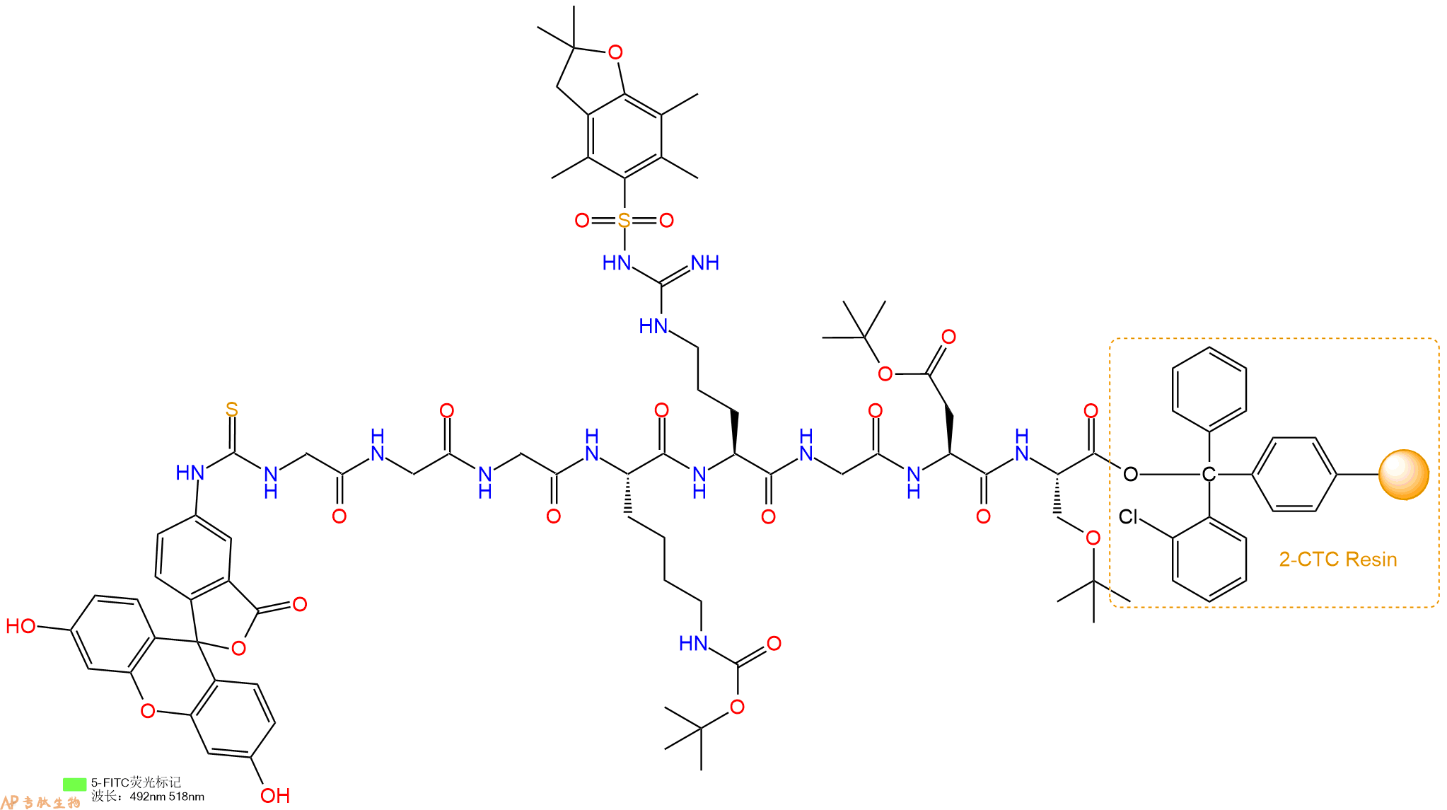 5、异硫氰酸荧光素酯 FITC反应连接:在上述树脂中,加入适当DMF后,再加入4.63mmol异硫氰酸荧光素酯 FITC到树脂中,再加入9.26mmol DIPEA,鼓氮气反应30分钟。用2倍树脂体积的DMF 洗涤3次树脂(洗涤树脂,去掉残留溶剂,为下一步反应做准备)。 得到5FITC-Gly-Gly-Gly-Lys(Boc)-Arg(Pbf)-Gly-Asp(OtBu)-Ser(tBu)-CTCResin。 结构如下:
