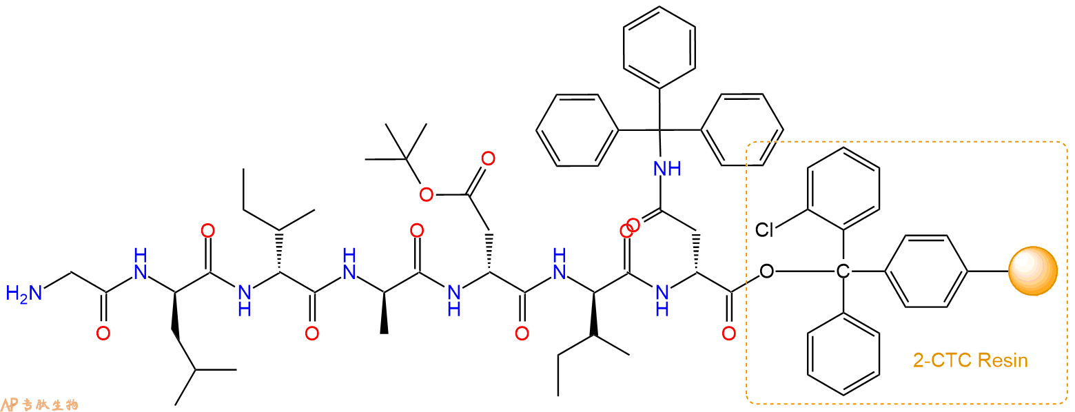最后再经过步骤二得到 H2N-Gly-DLeu-DIle-DAla-DAsp(OtBu)-DIle-DAsn(Trt)-CTC Resin,结构如下: