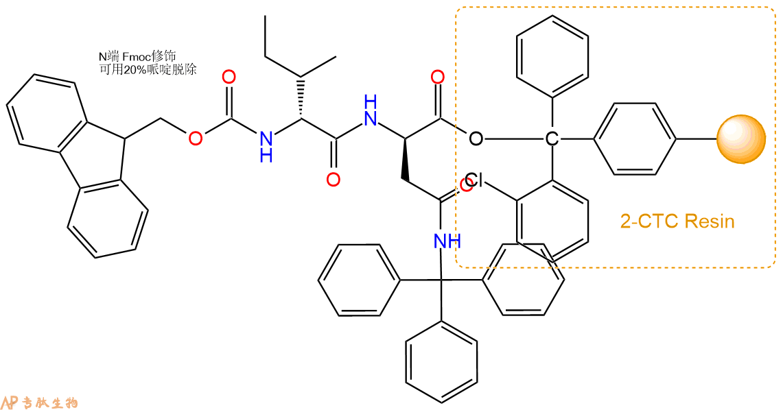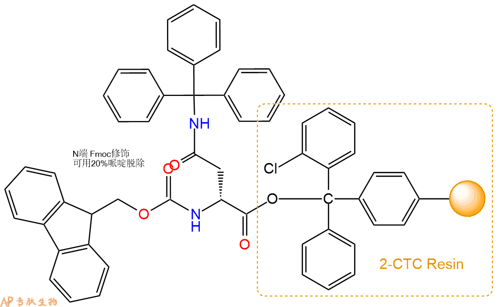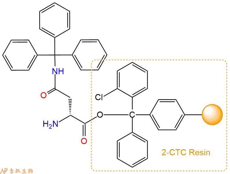1、合成CTC树脂:称取1.8g CTC Resin(如初始取代度约为0.66mmol/g)和1.43mmol Fmoc-DAsn(Trt)-OH于反应器中,加入适量DCM溶解氨基酸(需要注意,此时CTC树脂体积会增大好几倍,避免DCM溶液过少),再加入3.56mmol DIPEA(Mw:129.1,d:0.740g/ml),反应2-3小时后,可不抽滤溶液,直接加入1ml的HPLC级甲醇,封端半小时。依次用DMF洗涤2次,甲醇洗涤1次,DCM洗涤一次,甲醇洗涤一次,DCM洗涤一次,DMF洗涤2次(这里使用甲醇和DCM交替洗涤,是为了更好地去除其他溶质,有利于后续反应)。得到 Fmoc-DAsn(Trt)-CTC Resin。结构图如下: