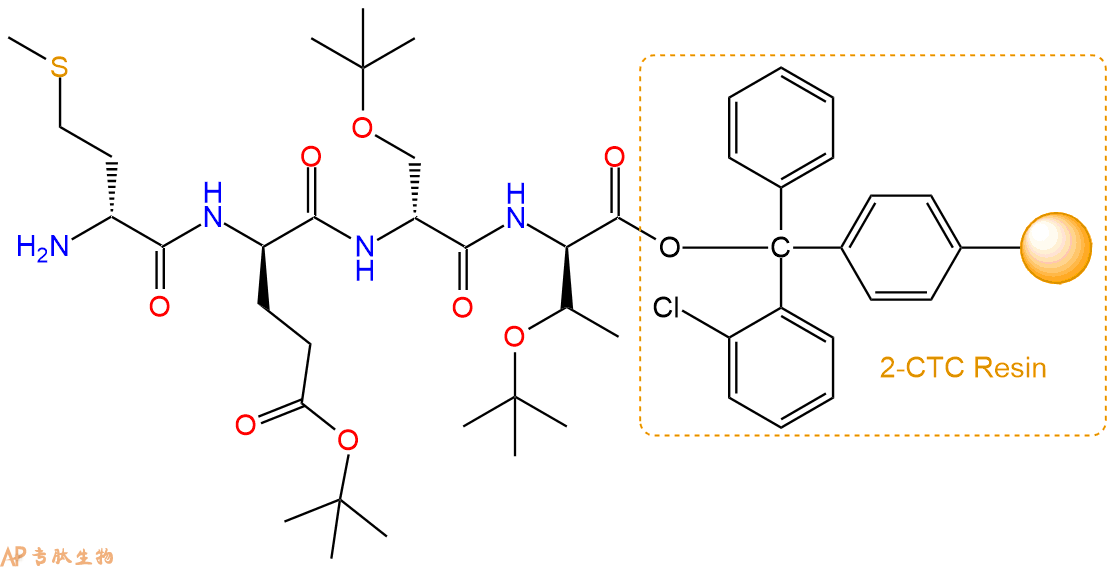最后再经过步骤二得到 H2N-DMet-DGlu(OtBu)-DSer(tBu)-DThr(tBu)-CTC Resin,结构如下: