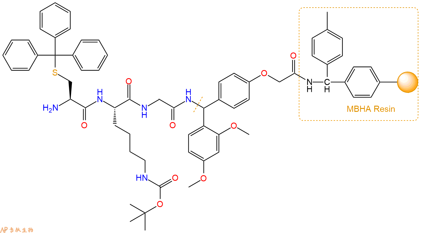 最后再经过步骤二得到 H2N-Cys(Trt)-Lys(Boc)-Gly-Linker-MBHA Resin,结构如下: