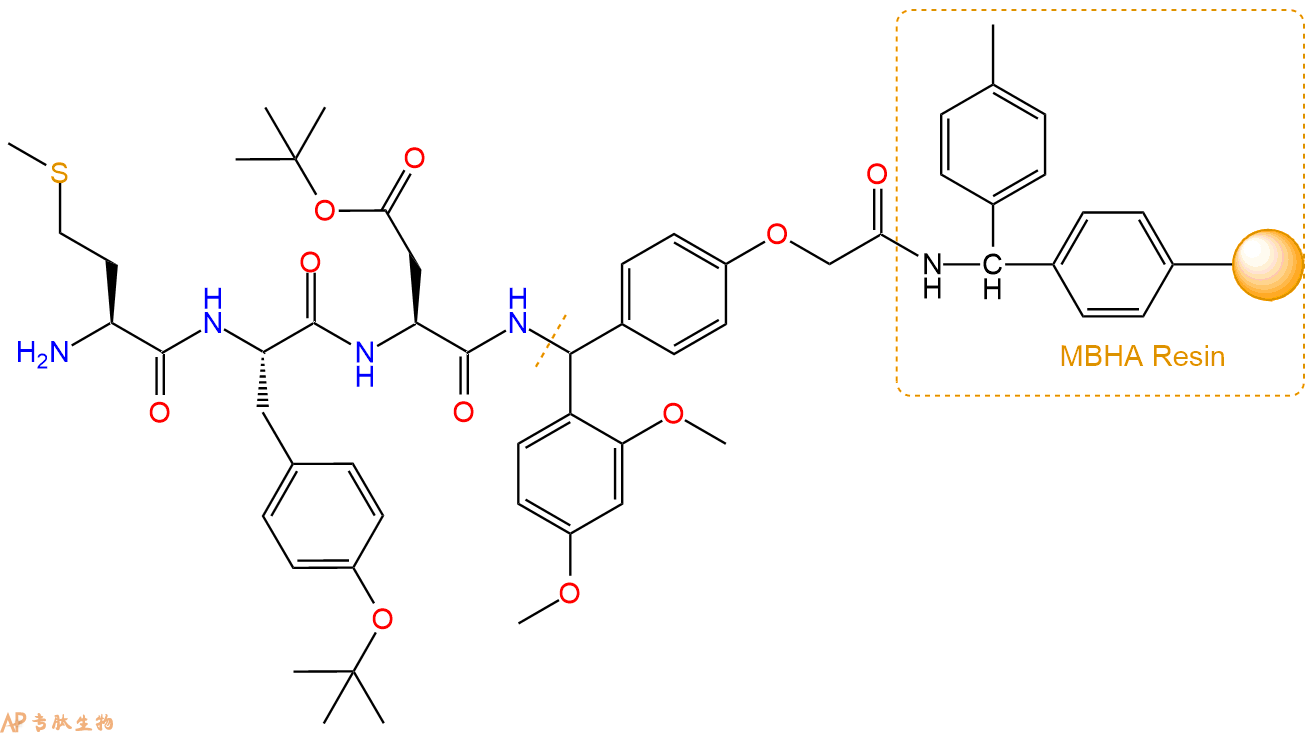 最后再经过步骤二得到 H2N-Met-Tyr(tBu)-Asp(OtBu)-Linker-MBHA Resin,结构如下: