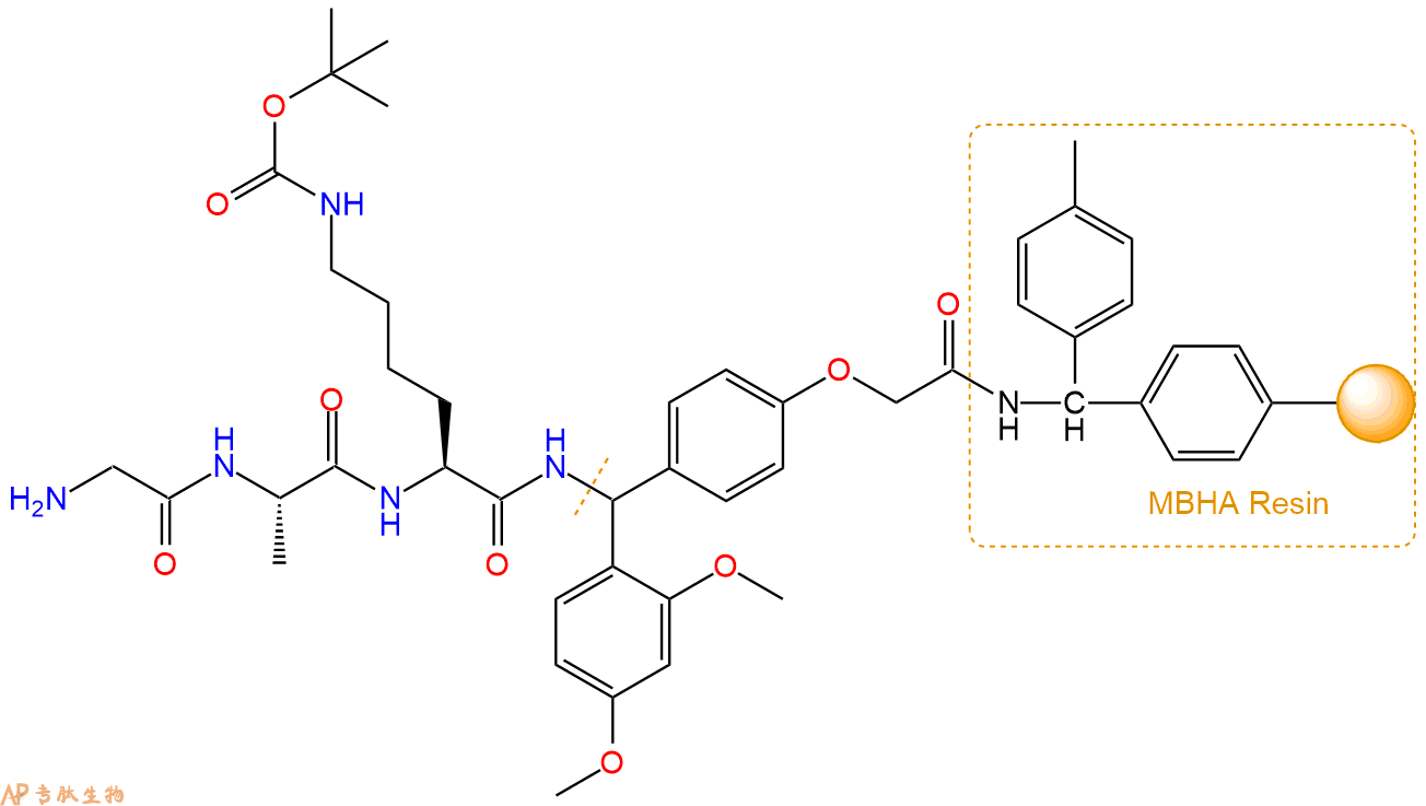 最后再经过步骤二得到 H2N-Gly-Ala-Lys(Boc)-Linker-MBHA Resin,结构如下: