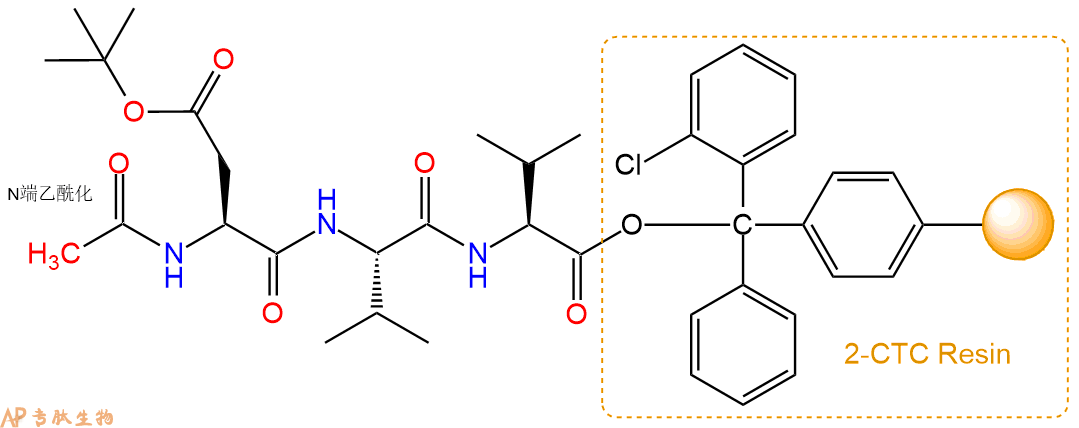 5、乙酸酐反应连接:在上述树脂中,加入适当DMF后,再加入0.94mmol乙酸酐到树脂中,再加入1.87mmol DIPEA,鼓氮气反应30分钟。用2倍树脂体积的DMF 洗涤3次树脂(洗涤树脂,去掉残留溶剂,为下一步反应做准备)。 得到Ac-Asp(OtBu)-Val-Val-CTCResin。 结构如下: